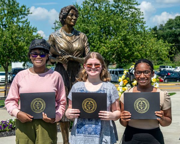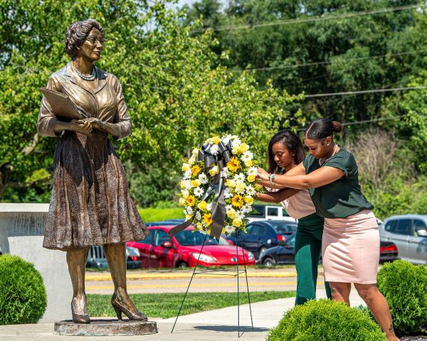 | The university held an observance and wreath-laying on August 26 to celebrate the life and legacy of alumna Katherine Johnson whose pioneering work at NASA helped America to win the space race. The ceremony featured the awarding of three Katherine Johnson scholarships to current STEM students and a donation to the Katherine Johnson Scholarship Fund made by Dr. Elisha Lewis, Assistant Professor of Education at WVSU, and Mrs. West Virginia American 2021. |