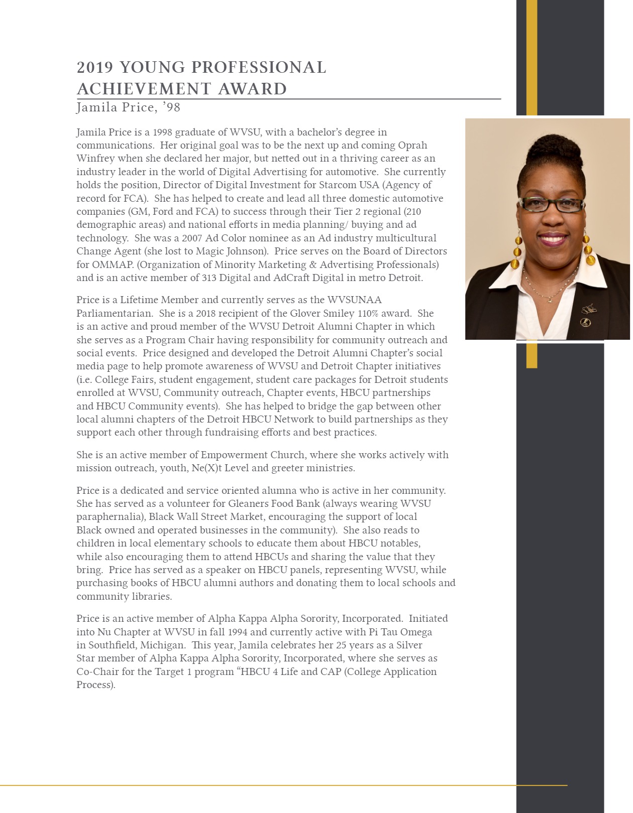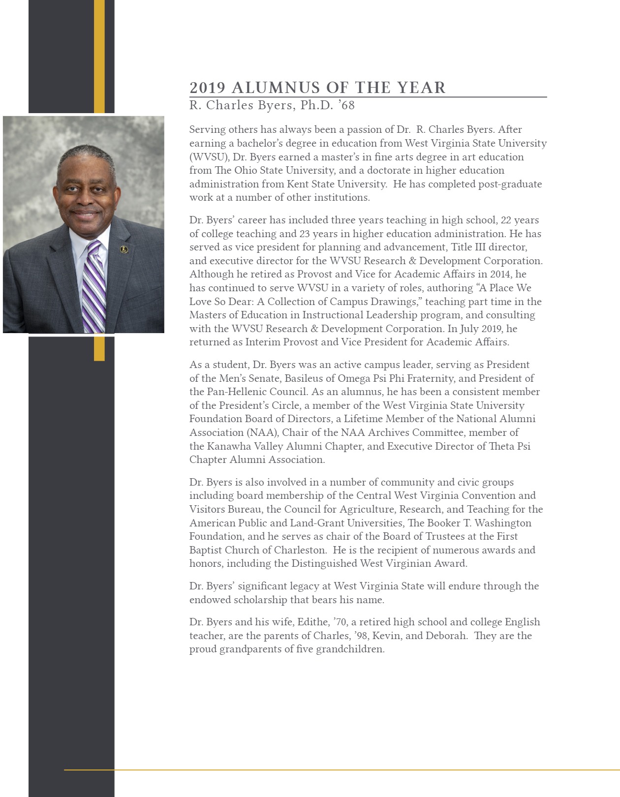 Welcome to your National Alumni Association webpage. As proud members of the West Virginia State University National Alumni Association, we share a common bond connected to the place we love so dear much bigger than ourselves. The NAA is committed to providing lifelong engagement through our personal friendships with each other, through our meetings, annual events, and on-going programs. As proud Yellow Jackets we give, network, and volunteer our time in support of the university. Our membership is strong, loyal, and eager to lend a helping hand to our students using five pipeline objectives: